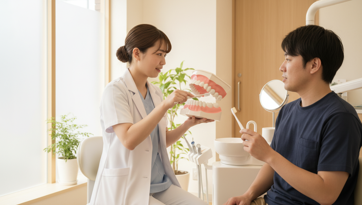 歯科衛生士が、患者さまの磨き方のクセ、磨き残しやすい場所、歯並びの状態などを確認し、一人ひとりに合った磨き方を丁寧に指導します。歯ブラシの選び方、持ち方、動かし方、歯間ブラシやデンタルフロスの使い方なども詳しくお伝えします。