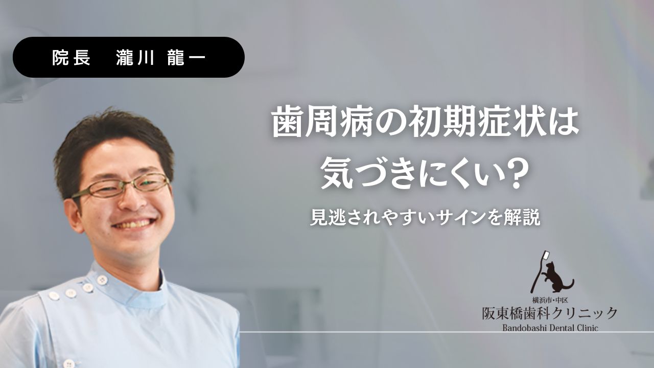この記事では、阪東橋歯科クリニック院長の瀧川龍一が、歯周病の初期症状として見逃されやすい6つのサインと、早期発見のポイントを詳しく解説します。セルフチェック方法もご紹介しますので、ぜひご自身のお口の健康を確認してみてください。